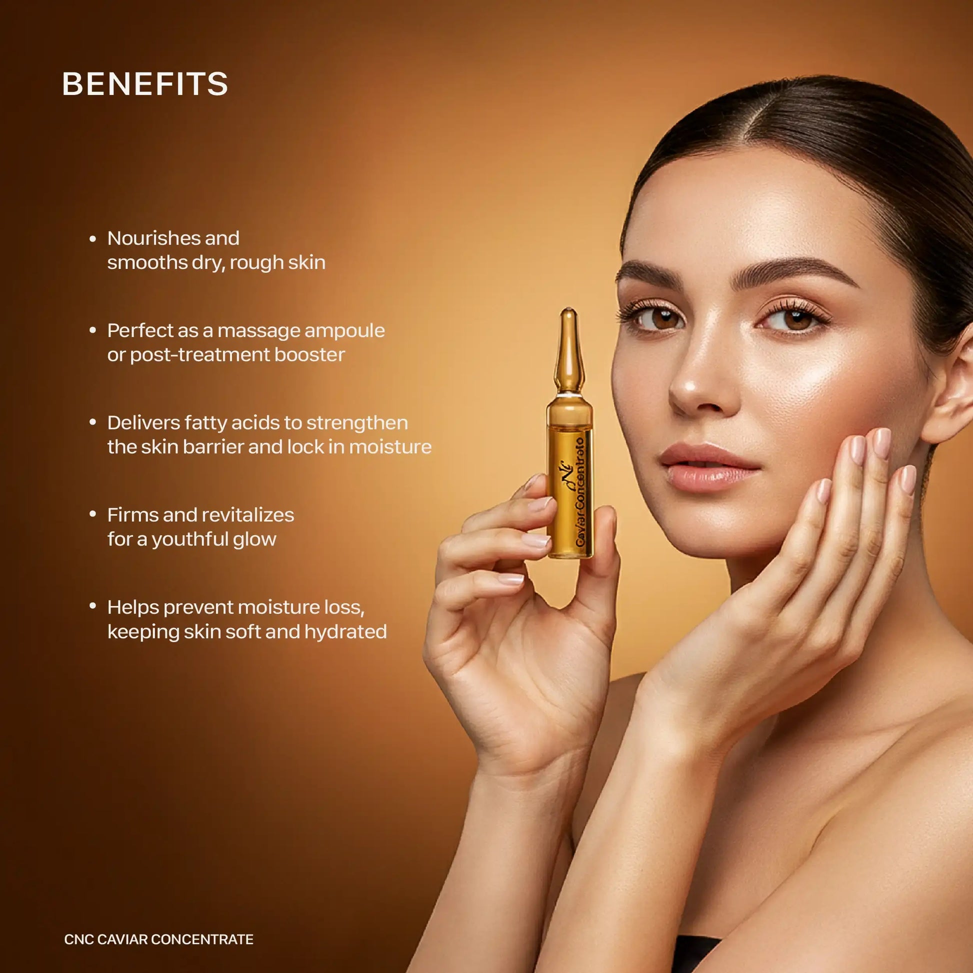 CNC Caviar Concentrate Ampoule is a rejuvenating treatment specially formulated for lipid-deficient skin. Enriched with essential fatty acids, it strengthens the skin’s barrier, helping to prevent moisture loss. The luxurious formula deeply nourishes and revitalizes, leaving the skin feeling soft, smooth, and visibly more relaxed with a healthy, radiant glow.