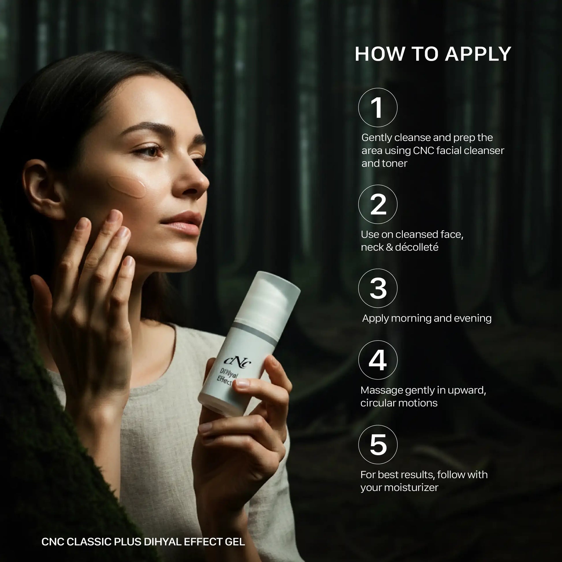 - Apply CNC Classic PLUS DiHyal Effect Gel to cleansed face, neck, and décolleté every morning and evening.