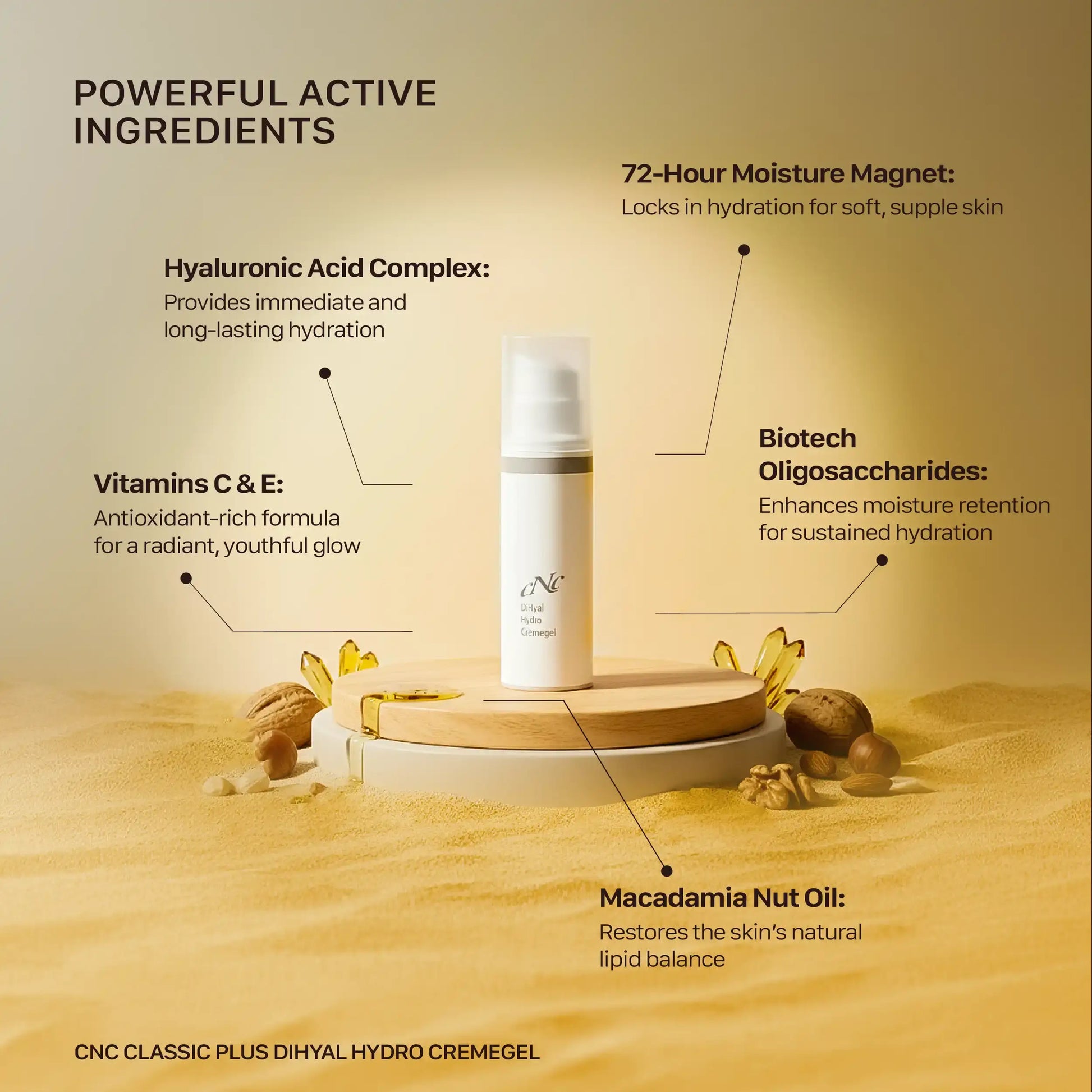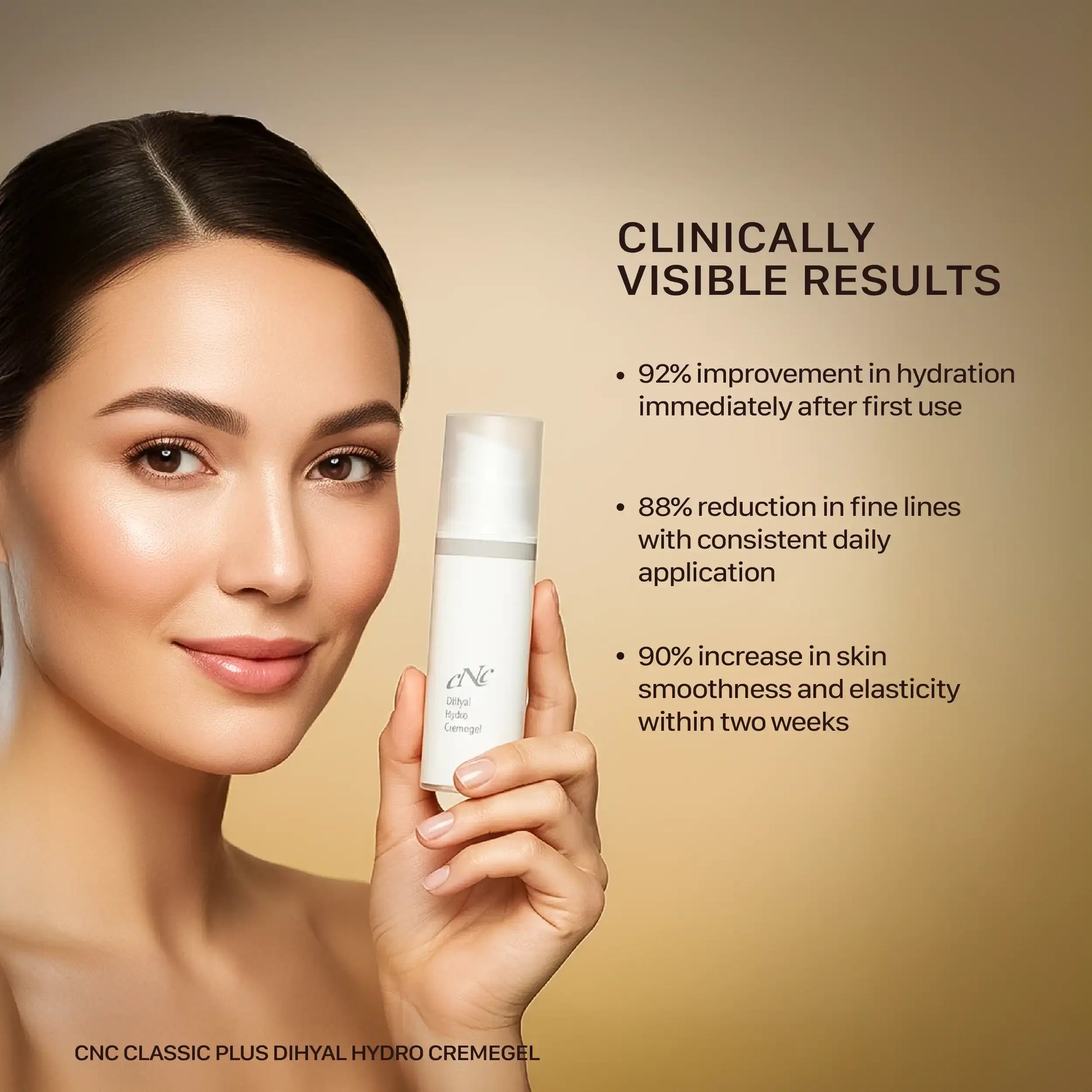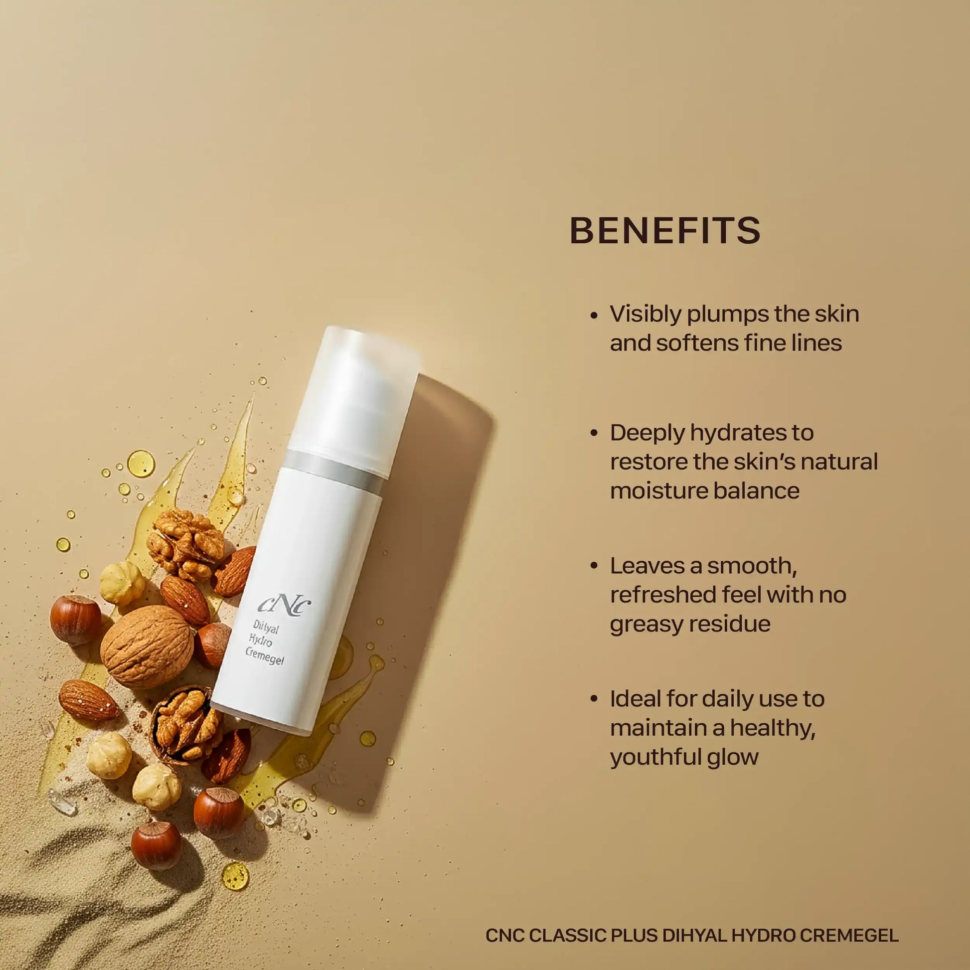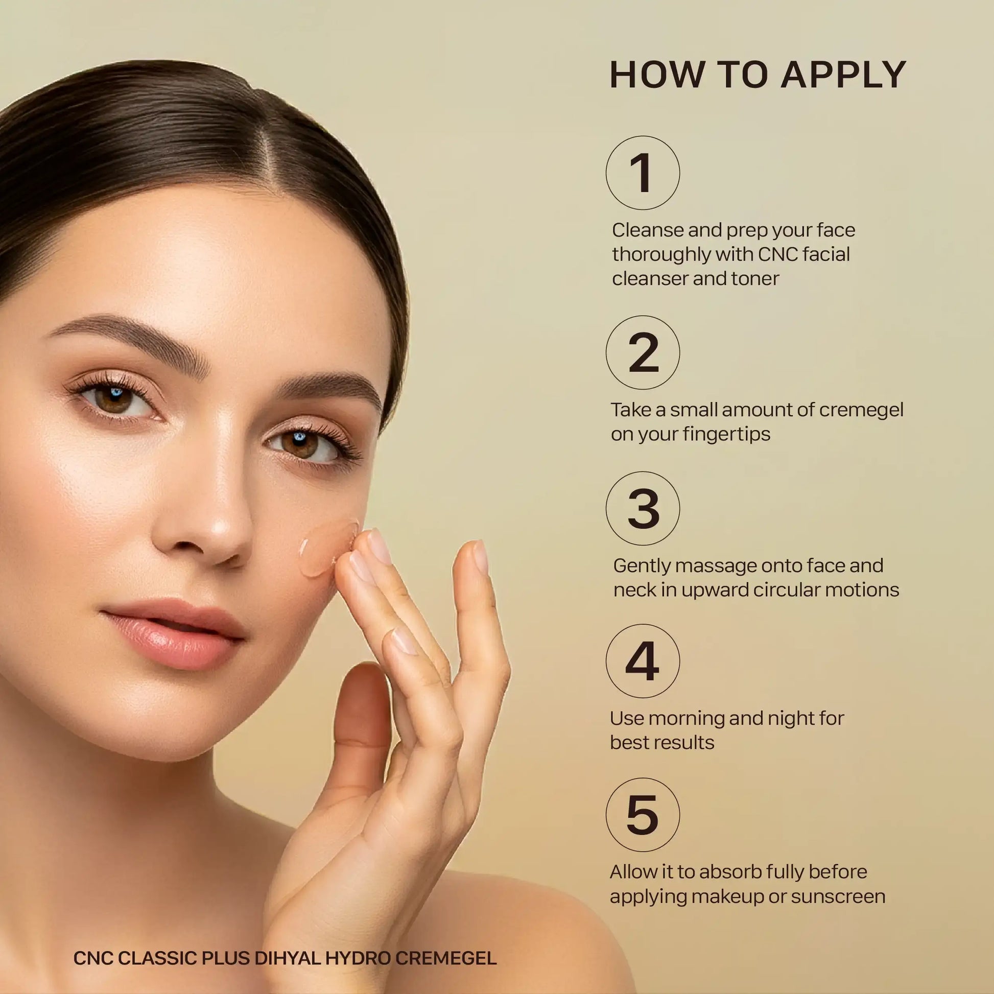- Apply CNC Classic PLUS DiHyal Hydro Cream Gel to cleansed skin every morning and evening.