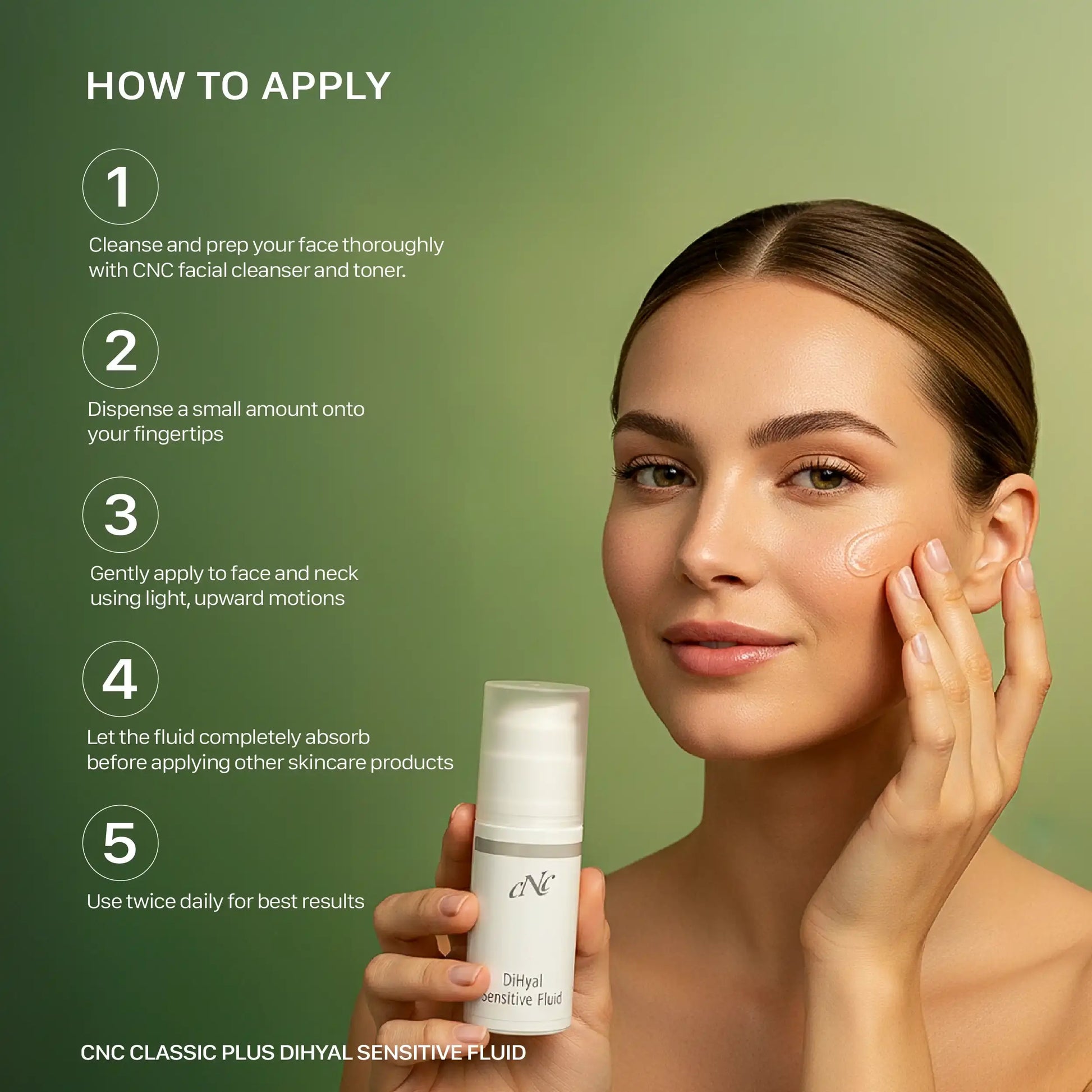 - Apply CNC classic PLUS DiHyal Sensitive Fluid every morning and evening after cleansing your skin.