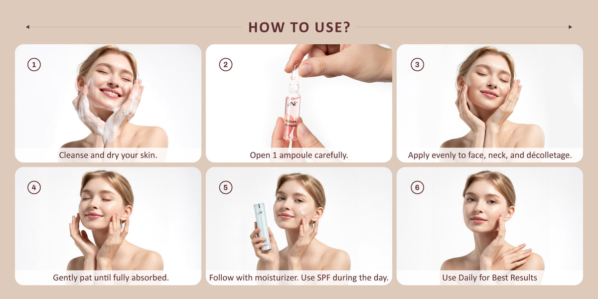 - Break open an ampoule and apply the serum to the face and neck